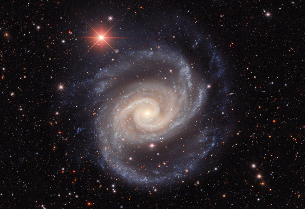 NGC 1566 is home to stars at all stages of stellar evolution. In this image, the bright blue color that outlines the arms of the galaxy arises from young, brightly burning stars. Darker spots within these arms are dust lanes. The arms are rich in gas, and form large-scale areas that provide the perfect environment for new stars to form. Closer to the center of the galaxy are cooler, older stars and dust, all evident by the redder color in the image. This galaxy has even been host to an observed stellar end-of-life event, when a supernova, named SN2010el, burst onto the scene in 2010.