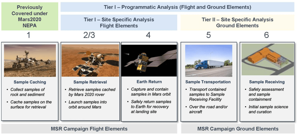 NASA and the European Space Agency are still looking for comments on the process to return Martian rock samples to Earth. Of the six steps needed to collect and return the samples (see graphic above), only the first step is currently underway with the Perseverance Rover exploring Mars. Now we need to get those samples home. You have until May 15th to get comments back to NASA on this.