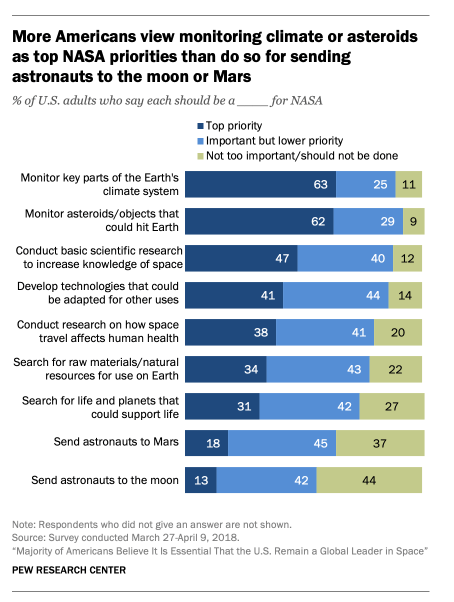 - Americans see priorities other than a Moon or Mars landing as more pressing for NASA.