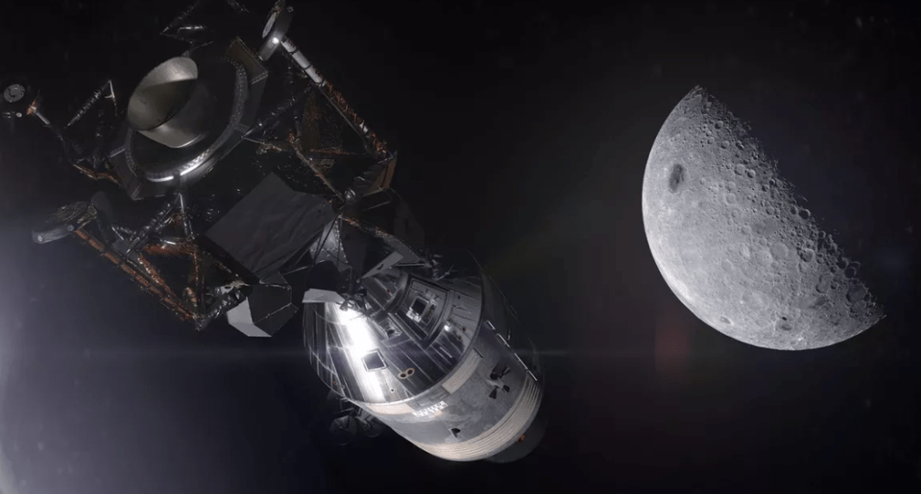 Image (Credit): Artist’s impression of Apollo 11 approaching the Moon. (PBS)