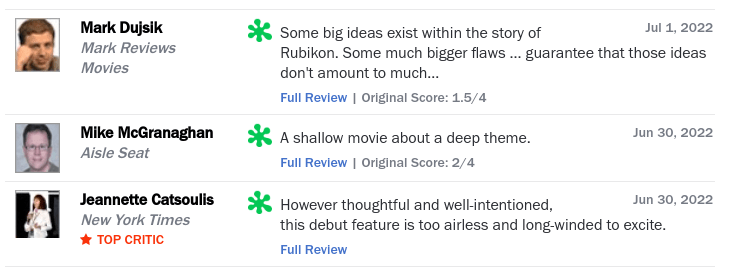So far, Rubikon has 30 percent on Rotten Tomatoes, so don’t get your hopes too high. Some of the reviews are shown below. Yet if you need a space adventure film this weekend, you now have one.
