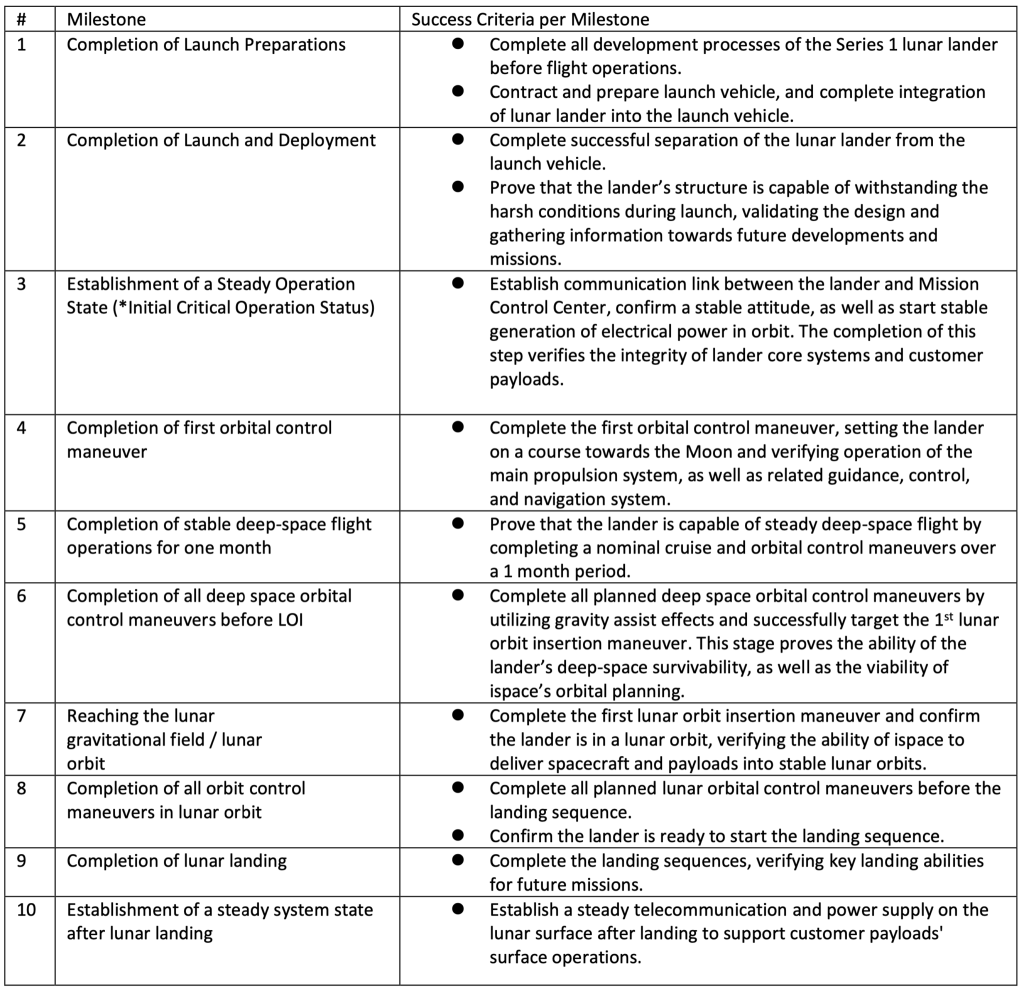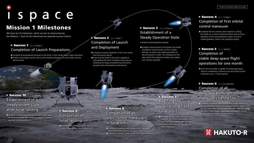 The Japanese private firm iSpace is behind the lunar mission, becoming the first private company to place a lander on the Moon. The lunar lander’s milestones are shown below, with the landing to occur next April.