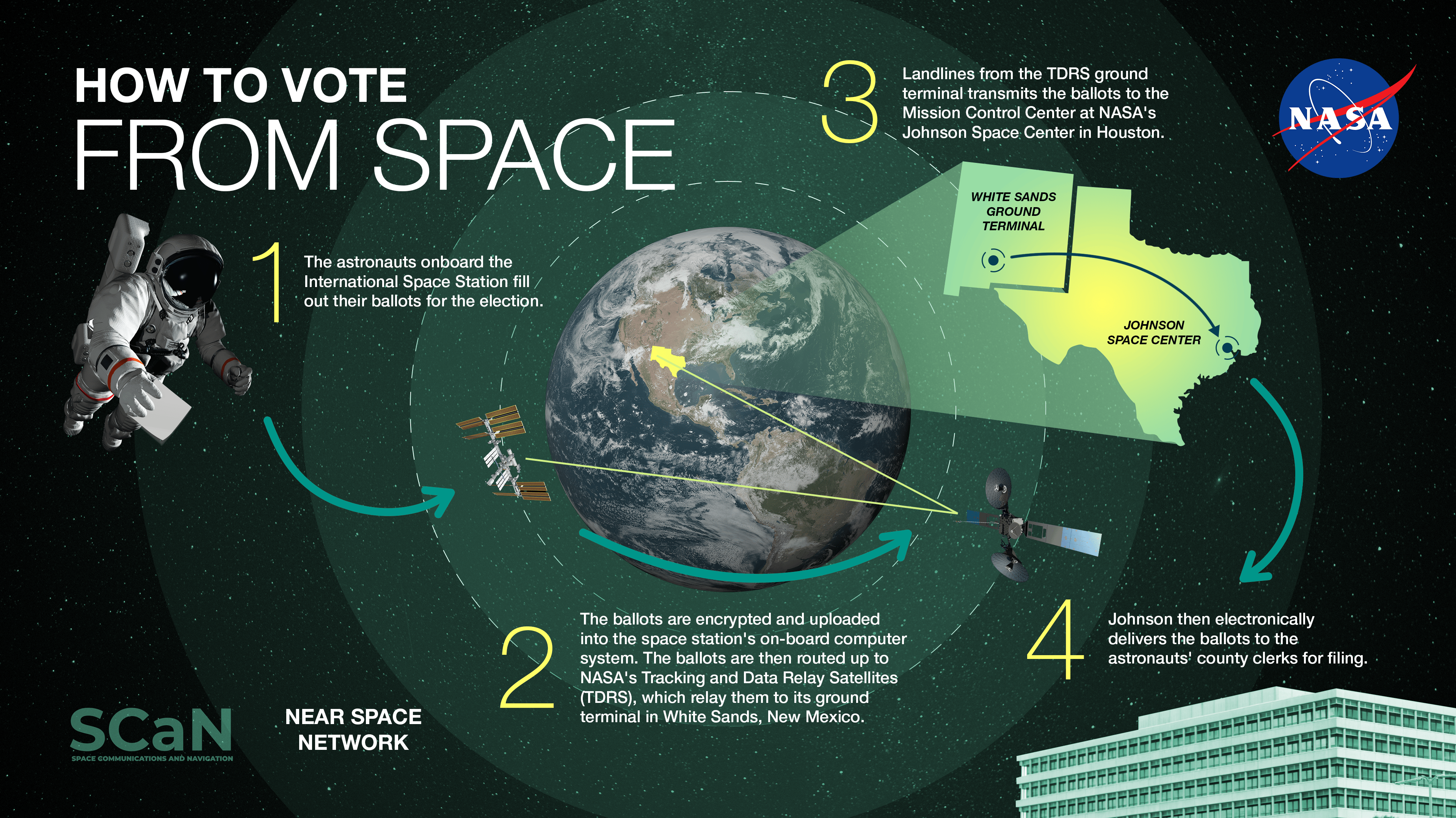 Just like any other American away from home, astronauts may fill out a Federal Post Card Application to request an absentee ballot. After an astronaut fills out an electronic ballot aboard the orbiting laboratory, the document flows through NASA’s Tracking and Data Relay Satellite System to a ground antenna at the agency’s White Sands Test Facility in Las Cruces, New Mexico.