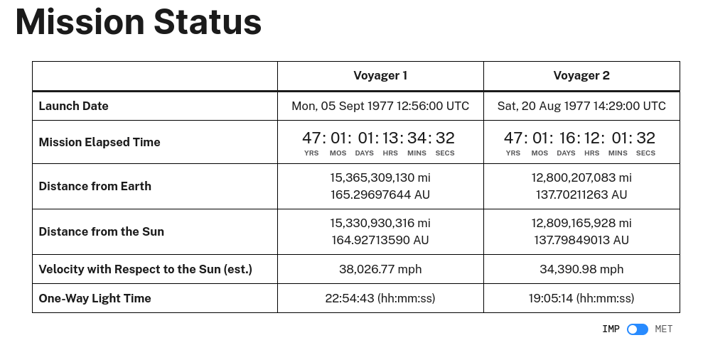 It is just amazing that the two Voyagers continue on their voyage beyond our solar system while sharing the experience with us. As of a few minutes ago, Voyager 1 was about 15.4 billion miles away (Voyager 2 is a little closer) and it took about 22 hours and 54 minutes for light to travel from the Voyager 1 spacecraft to Earth.