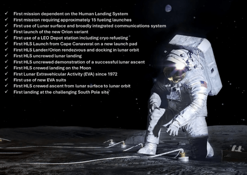 -Statement by Aerospace Safety Advisory Panel (ASAP) member Paul Sean Hill, as quoted by Space News. NASA contracted with SpaceX to develop the Human Landing System (HLS) for the astronauts landing on the Moon as part of Artemis III and later missions. While Blue Origin has also been tapped by NASA to assist with later missions, SpaceX was expected to provide the initial HLS. Maybe NASA should have picked two companies to provide the initial HLS, with the second in place still assisting with later landings. The ASAP’s 2024 Annual Report highlighted the many risks related to Artemis III, including several related to the HLS (shown below). Everyone knew this was going to be difficult, and no one wants to be asked to answer “Who Lost the Moon?” Also, it is good we still have a few advisory panels left after the recent purge.