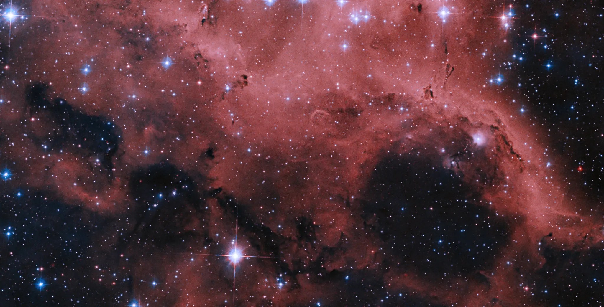 About 1,000 light-years across, N11’s sprawling filaments weave stellar matter in and out of each other like sparkling candy floss. These cotton-spun clouds of gas are ionized by a burgeoning host of young and massive stars, giving the complex a cherry-pink appearance. Throughout N11, colossal cavities burst from the fog. These bubbles formed as a result of the vigorous emergence and death of stars contained in the nebulae. Their stellar winds and supernovae carved the surrounding area into shells of gas and dust.