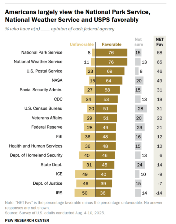 A recent Pew Research Center report titled Republicans’ Views of Justice Department, FBI Rebound as Democrats’ Views Shift More Negative found that NASA was among the fourth most favorably viewed federal agency from among 16 agencies. Not surprisingly, the IRS placed last. However, it was joined at the bottom by ICE and the Department of Justice.
