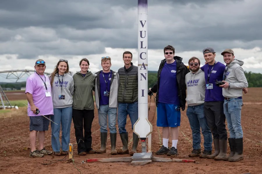 Image (Credit): 2025 winning team participants from James Madison University with their high-powered rocket prior to launch. (NASA/Krisdon Manecke)