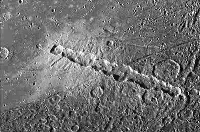 There are also strings of craters found on two of the moons, Callisto and Ganymede. These crater chains were first spotted when the Voyager 1 spacecraft gave us some of the first pictures of the surface of these moons in 1979. They were thought to potentially be collapsed lava tubes, features that have been observed on Mars and the moon. However, their origin remained under debate until the Shoemaker-Levy 9 comet was observed as it smashed into Jupiter. The comet was seen breaking into multiple pieces and this gave an idea as to how these chains might form—the gravity from Jupiter pulls apart objects into many pieces that all impact close together.