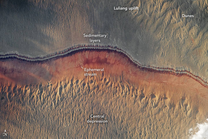 The reddish ribbon across the middle of this photo marks a change in local topography. Uplifted, older sedimentary layers to the north—part of the Luliang uplift—slope down toward a geographic depression to the south. Eroded rocks have drainage patterns that lead to an ephemeral stream at lower elevations. On both the top and bottom of the photo, long sand dunes oriented north-south overlay the bedrock. Beneath the surface, organic-rich rock layers preserve fossils and contain extensive coal, oil, and gas deposits.