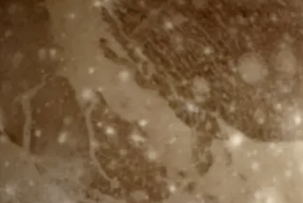 The image above (and a fuller view below) shows the surface of Jupiter’s moon Ganymede. NASA explains: